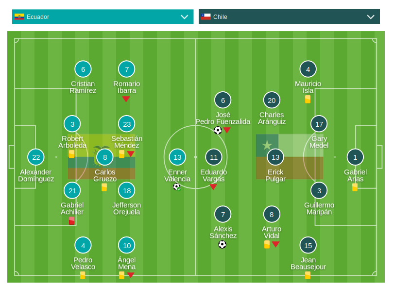 Ecuador no pudo volver a inquietar a la defensa chilena, a pesar de los ingresos de jugadores como Antonio Valencia, Carlos Gárces y Ayrton Preciado, quienes junto a sus compañeros lo intentaron hasta el minuto final. Y, gracias al juego fuerte durante el partido, Gabriel Achilier viejo la tarjeta roja tras una falta sobre Arturo Vidal.